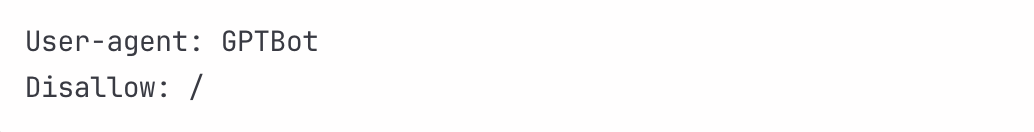 To prevent GPTBot from crawling any part of your site, include the following in your site's robots.txt: